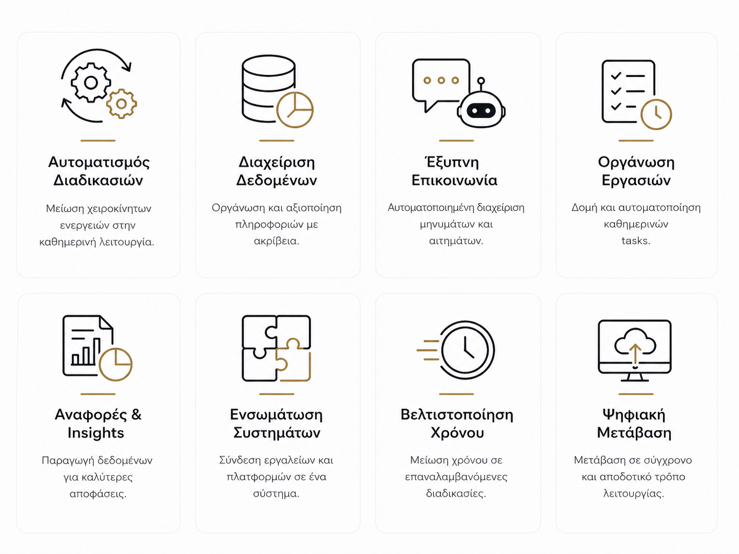 Ενσωματώνουμε λύσεις τεχνητής νοημοσύνης και αυτοματισμών που μειώνουν τον χρόνο, περιορίζουν τα λάθη και απλοποιούν τη λειτουργία.